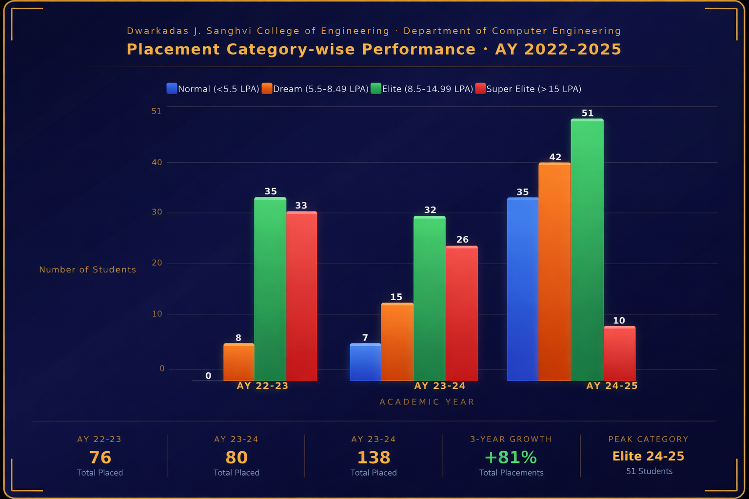 The vision of the Department is to produce professionally competent engineers capable of meeting global challenges. Computer Department is consistent in placing almost 100% student appeared for the placement process. Based on the company profile, job role offered, package and working environment companies are classified as Super Dream, Dream and Normal company. Our aim is not only to place the student but also to provide a student with Super Dream offer. In Academic Year 2021-22 highest package offered was 28 LPA.
